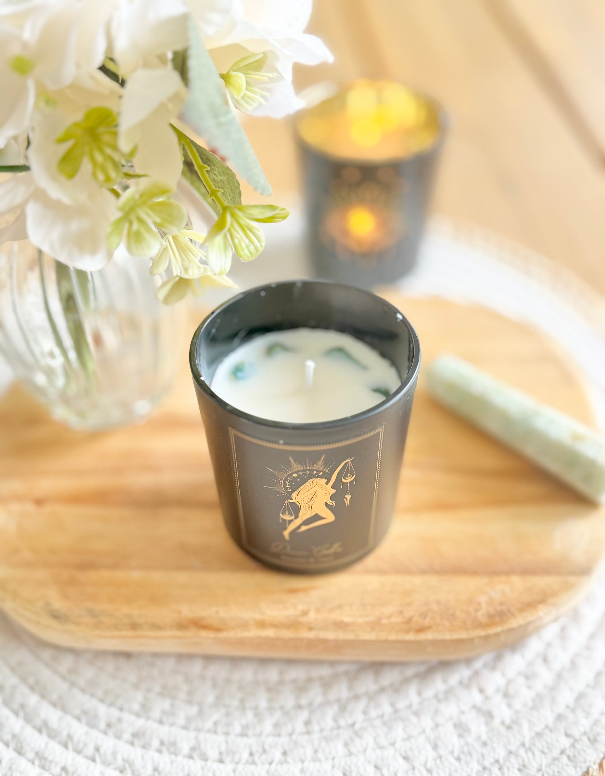 Bougie de manifestation brillante en verre, coulée à la main à partir de cire de soja et de palme. Aux huiles essentielles et pierres précieuses. Lorsque la bougie brûle, les pierres précieuses coulent avec la cire. Lorsque la bougie est terminée, vous pouvez conserver les pierres précieuses.