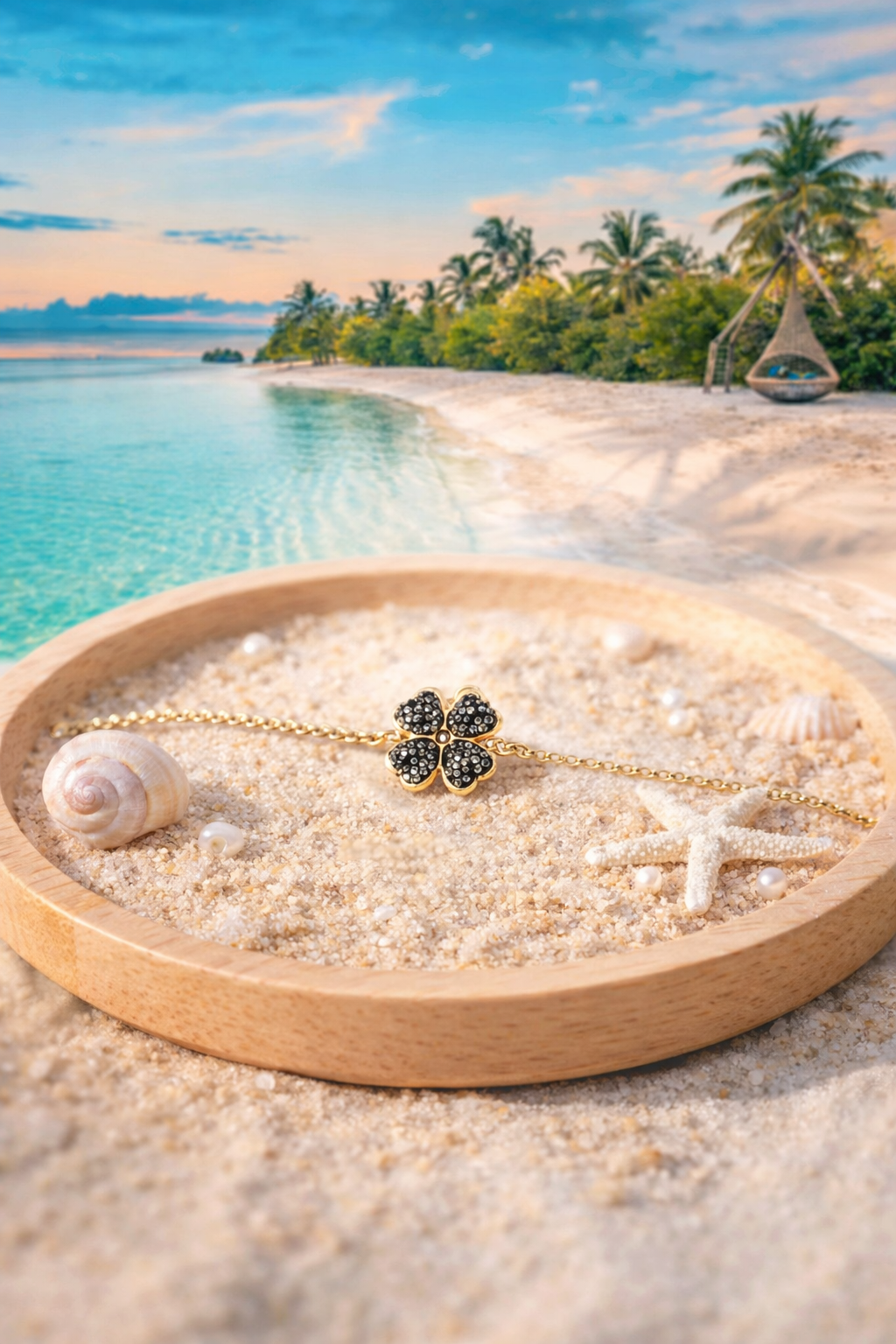 - Bracelet doré avec un pendentif trèfle 4 feuilles serti de petites perles/strass noirs Style chic, élégant, très tendance , porte-bonheur