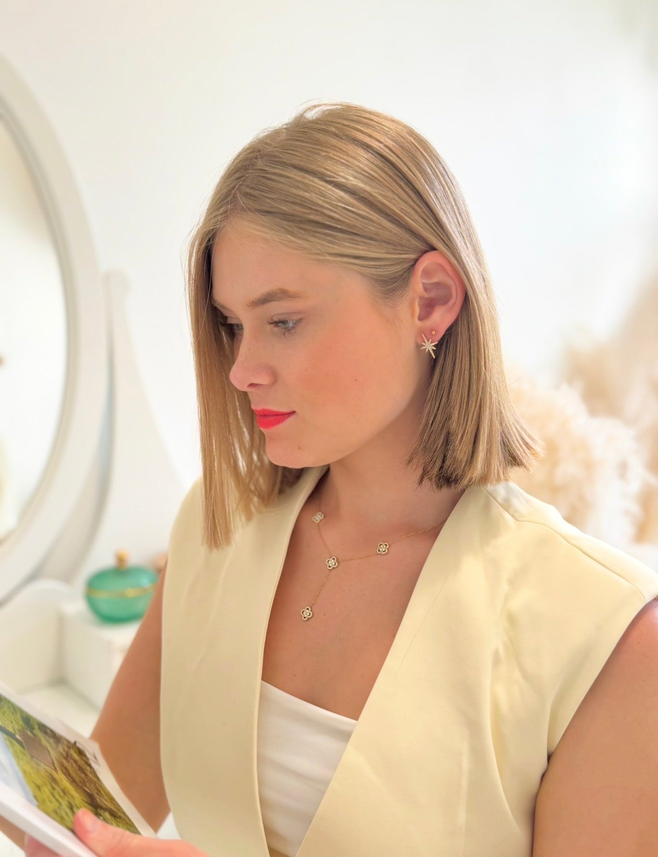 Laissez-vous séduire par ce collier fin et féminin, véritable ode à la délicatesse. Sa chaîne dorée légère sublime le cou avec élégance, tandis que ses motifs floraux scintillants, finement sertis, captent la lumière à chaque mouvement. ✨
