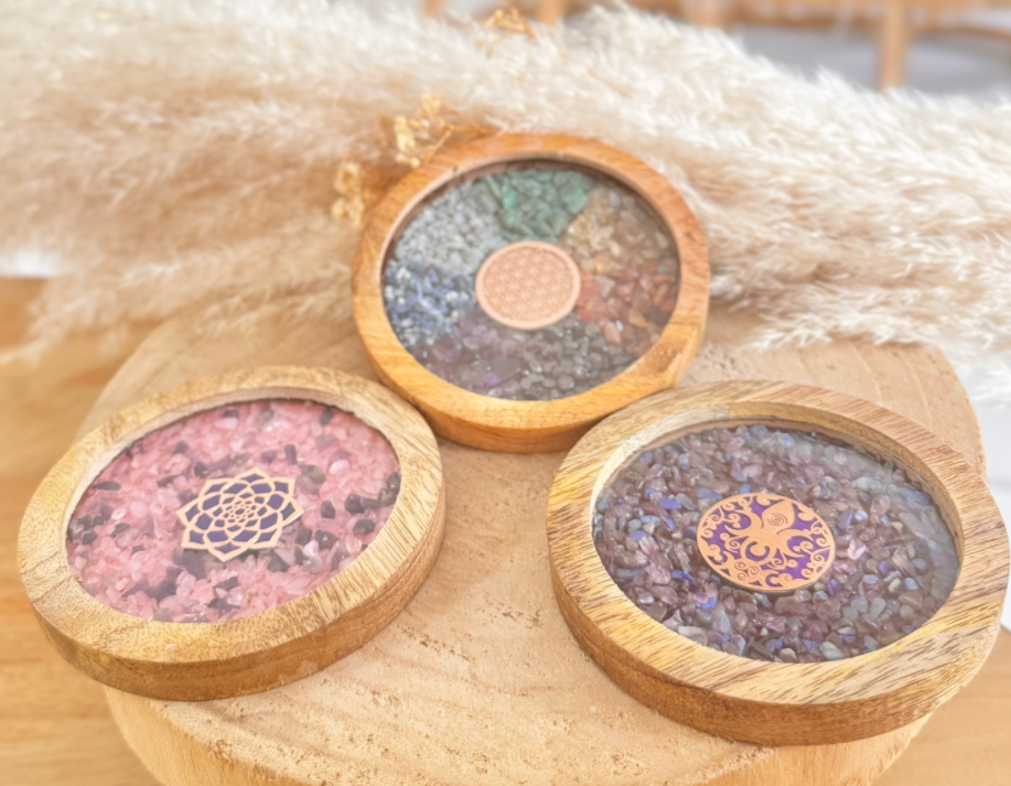 Dessous de verre : simple objet déco pour sublimer une table , objet utile pour dynamiser son eau de boisson , objet indispensable pour nettoyer et énergétiser ses minéraux .