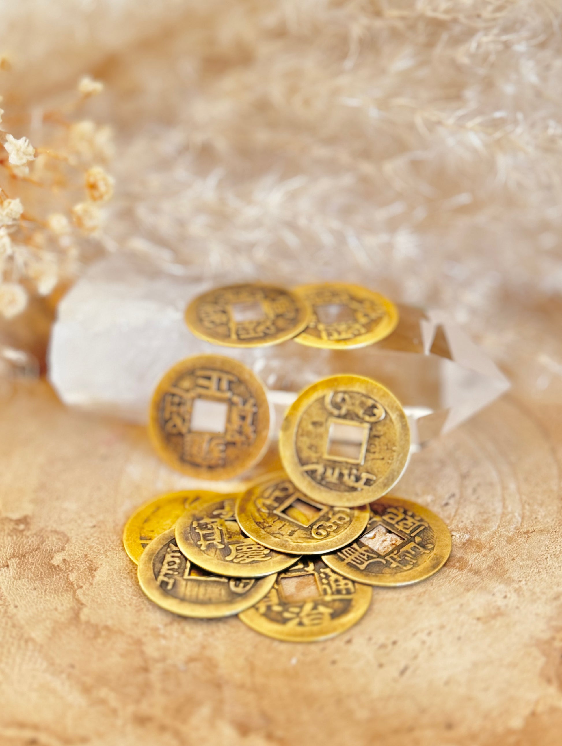 Des cinq éléments, le cuivre appartient à l'élément métallique. Le cuivre est plus efficace que l'or ou l'argent pour absorber l'énergie. Les pièces d'empereur éloignent les énergies négatives et les mauvais esprits. Attachées ensemble, les 10 pièces forment un magnifique pendentif de protection par exemple mais je donne d autres façons de les utiliser en dessous .