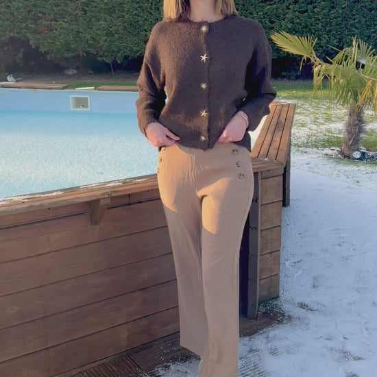Sa coupe fluide allonge la silhouette, tandis que sa taille haute et ses boutons décoratifs apportent une touche raffinée et féminine. ✨
